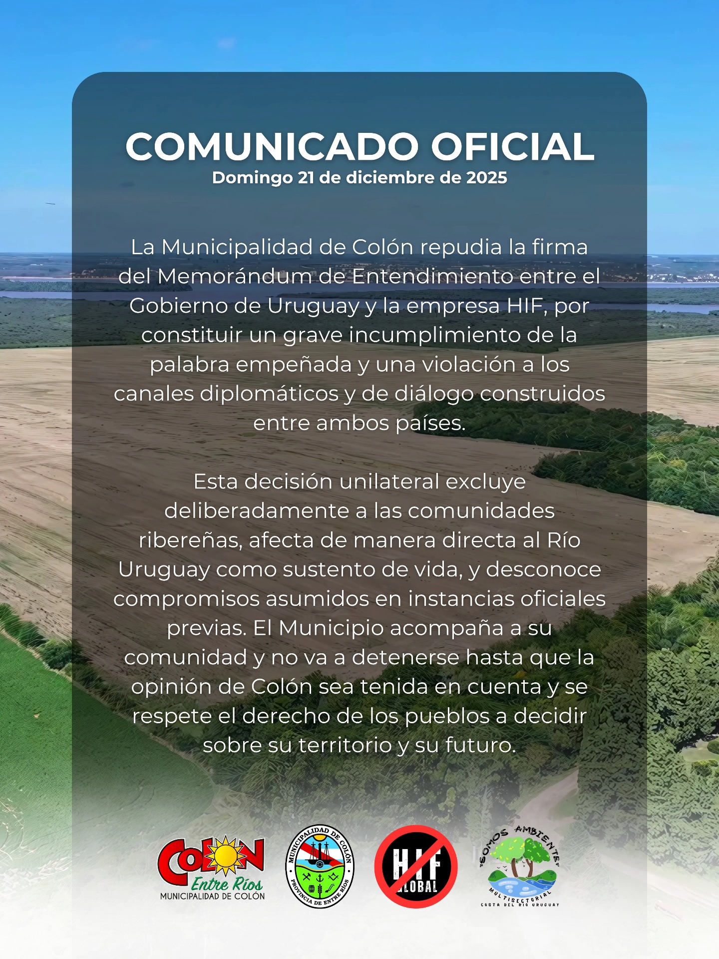 La Municipalidad de Colón repudió la firma del Memorándum de Entendimiento entre el Gobierno de Uruguay y la empresa HIF, por tratarse de “una decisión unilateral que incumple compromisos asumidos, vulnera los canales de diálogo y excluye a las comunidades ribereñas”.