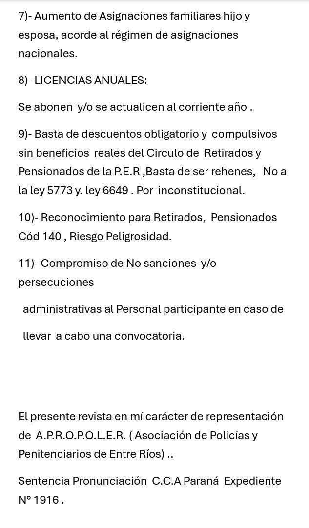 -Hay malestar. Circula una convocatoria en redes sociales para reclamar en Casa de Gobierno el 16 de marzo. Nosotros no estamos en eso. Apoyamos el reclamo, pero no organizamos nosotros.Nosotros creemos que puede haber un canal de diálogo, como lo venimos haciendo siempre. De todos modos, nosotros venimos desde el año pasado insistiendo en la necesidad que haya una mejora salarial para el policía. No puede ser que un salario familiar de una esposa sea quince pesos. Lo que nosotros pretendemos hoy es un aumento del 30% mínimo, que vaya al básico. Pero de una vez, no como los legisladores, que se aumentan en cuotas. Queremos un aumento que sea real. Que ofrezcan un bono a los policías no es legal, es aumento en negro, como ese bono de $25 mil. Ese tipo de sumas no se trasladan al retirado.