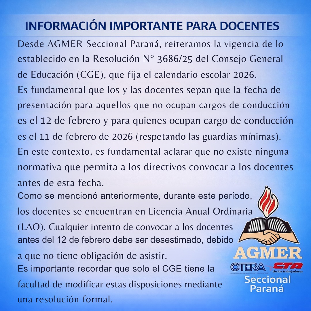 “Es fundamental que los y las docentes sepan que la fecha de presentación para aquellos que no ocupan cargos de conducción es el 12 de febrero y para quienes ocupan cargos de conducción es el 11 de febrero de 2026 (respetando las guardias mínimas”, señaló Agmer Paraná. “En este contexto, es fundamental aclarar que no existe ninguna normativa que permita a los directivos convocar a los docentes antes de esta fecha”, agregó.