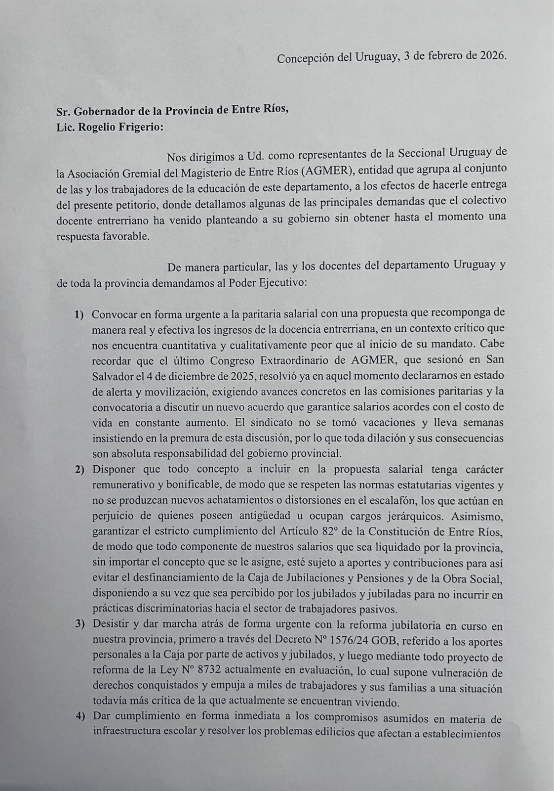 En el mismo sentido, Agmer Uruguay demandó la derogación de la resolución N° 1.431, dictada en 2025 por el CGE y que puso límites a la realización de las asambleas docentes en las escuelas, norma “considerada antisindical por restringir asambleas en los lugares de trabajo y vulnerar la libertad de organización”.