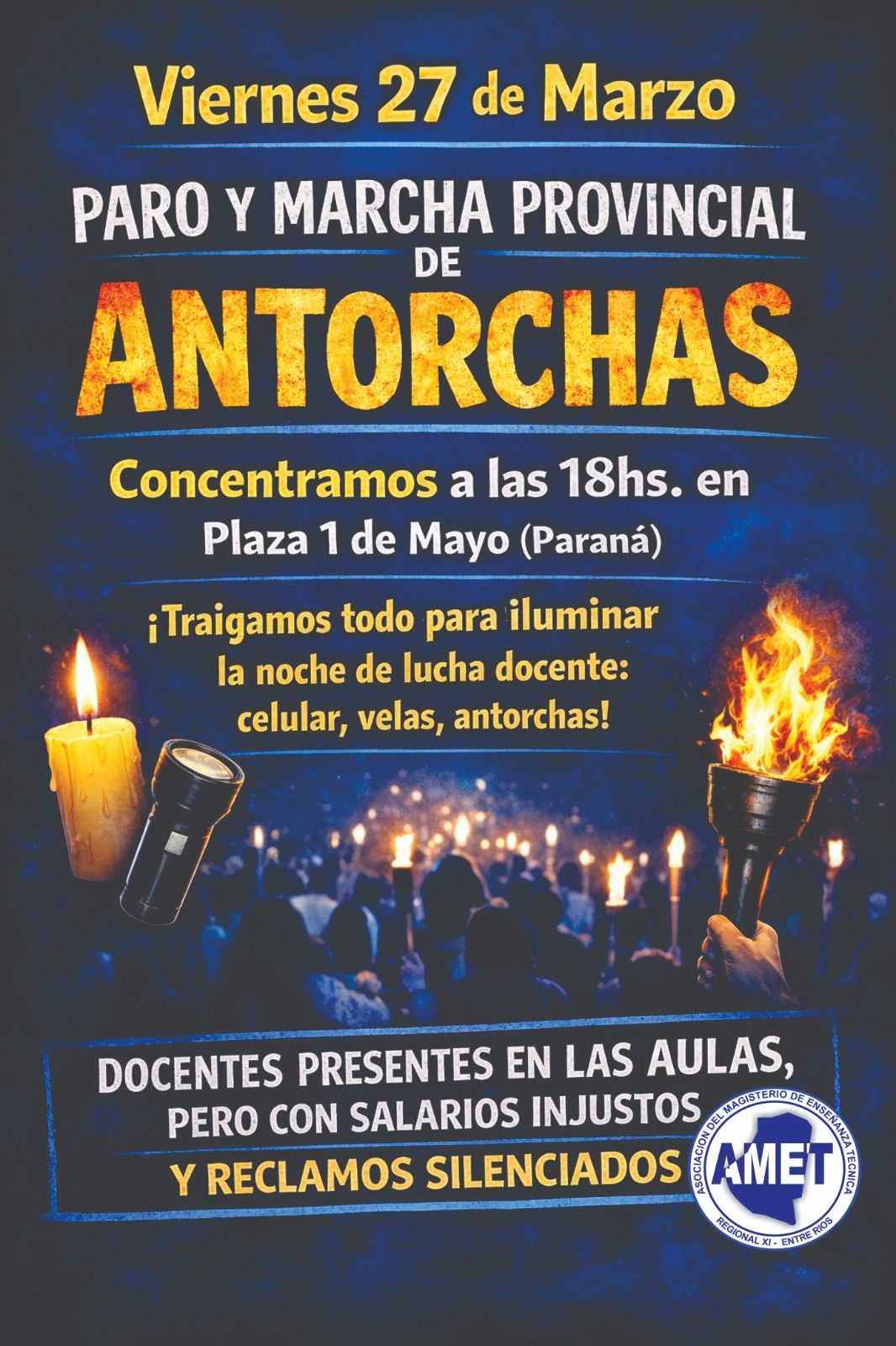 La Asociación del Magisterio de Enseñanza Técnica (Amet) también convocó a una huelga de 24 horas para este viernes 27, que incluirá una marcha provincial de antorchas en Paraná.