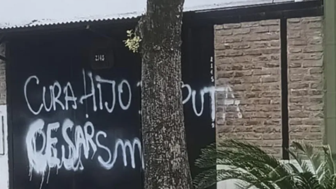 Los escraches no tardaron en viralizarse en redes sociales. Frente a la propiedad de calle De la Madrid se escribió una mensaje: “Cura hijo de puta”.