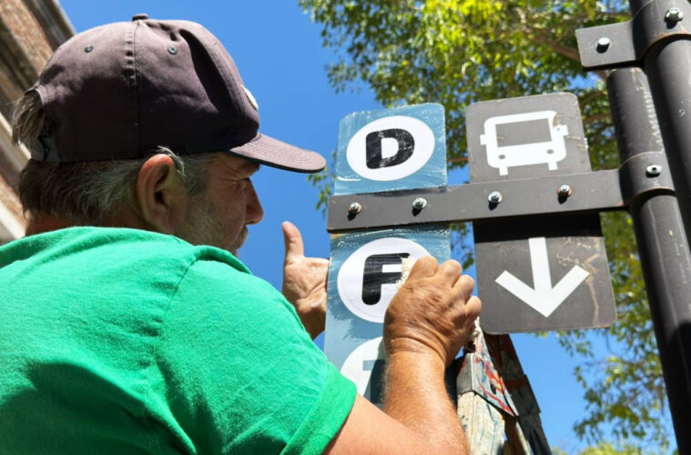 Las tareas son realizadas por personal municipal en las multiparadas y en las arterias principales. También se colocan las correspondientes letras que reemplazarán a los tradicionales números de las líneas.