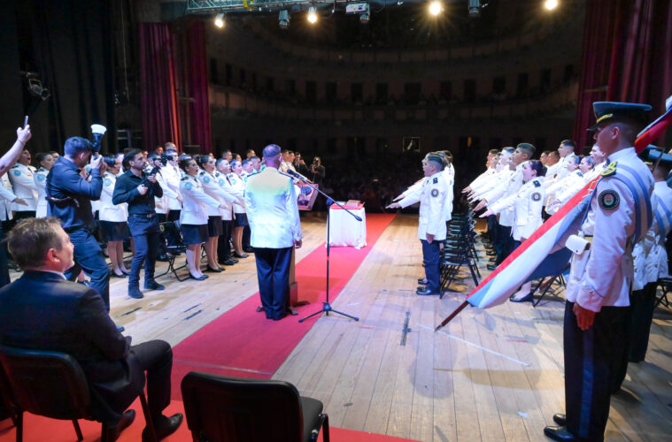 Se realizó en el Teatro 3 de Febrero, de Paraná, la ceremonia de egreso de la Promoción LXXXVII de Oficiales Ayudantes de la Policía de Entre Ríos. El ministro de Seguridad y Justicia, Néstor Roncaglia, presidió el acto junto al jefe de Policía, Claudio González. Los 78 oficiales egresados, 24 mujeres y 54 hombres, provenientes de diversas localidades, culminaron tres años de formación intensiva en la Escuela Superior de Oficiales Dr. Salvador Maciá, donde cursaron cátedras jurídicas, humanísticas y específicas de la labor policial. Al finalizar sus estudios, recibieron el título de Técnico Superior en Seguridad Pública y Ciudadana orientada a la Formación Policial, avalado por la Universidad Autónoma de Entre Ríos (Uader). La ceremonia incluyó la recepción de autoridades, el ingreso de abanderados y escoltas, y la entonación del Himno Nacional Argentino y la Marcha de Entre Ríos. También se escucharon las palabras del jefe de Policía. Más tarde, se llevó a cabo la tradicional toma de juramento a la Constitución, un momento cargado de simbolismo que reafirma el compromiso de los nuevos oficiales con la defensa de los derechos y garantías de la ciudadanía. El ministro Roncaglia destacó la importancia del acto para la institución y para la comunidad entrerriana. «Hoy celebramos el esfuerzo, la vocación y el compromiso de cada uno de los estudiantes. Esta ceremonia representa no solo el cierre de una etapa de formación, sino también el inicio de una carrera de servicio público que exige responsabilidad, profesionalismo y entrega», expresó. «Nuestra Policía necesita mujeres y hombres capacitados, éticos y preparados para enfrentar los desafíos de la seguridad ciudadana. Desde el Ministerio de Seguridad y Justicia vamos a continuar fortaleciendo los procesos formativos y brindando las herramientas necesarias para que cada oficial pueda cumplir su misión con excelencia», agregó.