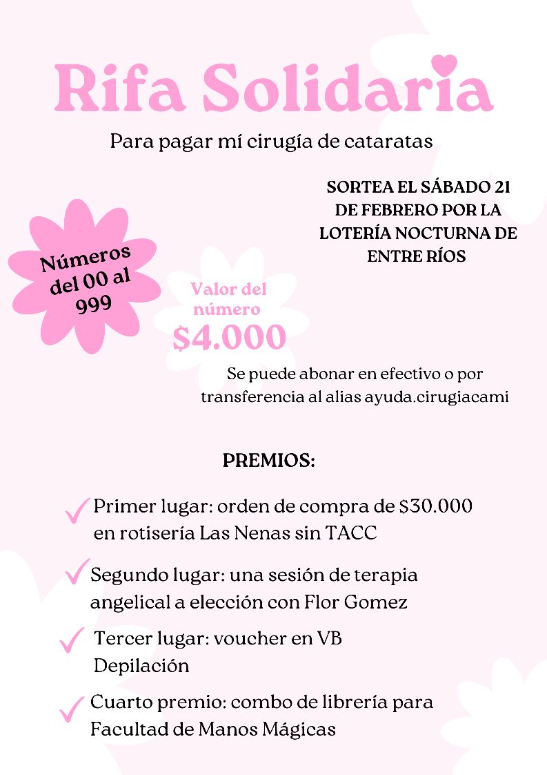 Rifa solidaria para pagar mi cirugía de cataratas”, dice el posteo que publicó en redes sociales. Hay cinco premios, y 100 números. Ya los ha vendido a casi todos. Sortea el sábado 21 por la Lotería de Entre Ríos Nocturna.