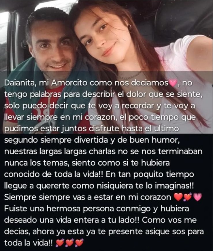 “Daianita, mi Amorcito como nos decíamos, no tengo palabras para describir el dolor que se siente, solo puedo decir que te voy a recordar y te voy a llevar siempre en mi corazón, el poco tiempo que pudimos estar juntos disfrute hasta el ultimo segundo, siempre divertida y de buen humor, nuestras largas charlas no se nos terminaban nunca los temas, siento como si te hubiera conocido de toda la vida!! En tan poquito tiempo llegue a quererte como ni siquiera te lo imaginas!! Siempre siempre vas a estar en m corazón. Fuiste una hermosa persona conmigo”.