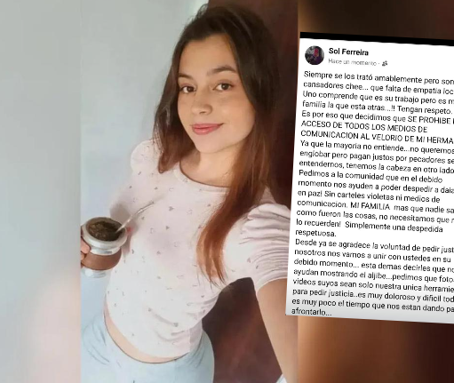 “Siempre se los trató amablemente pero son cansadores che… que falta de empatía loco!! Uno comprende que es su trabajo pero es mi familia la que está atrás…!! Tengan respeto. Es por eso que decidimos que se prohíbe el acceso de todos los medios de comunicación al velorio de mi hermana!! Ya que la mayoría no entiende… no queremos englobar pero pagan justos por pecadores, sepan entendernos, tenemos la cabeza en otro lado.