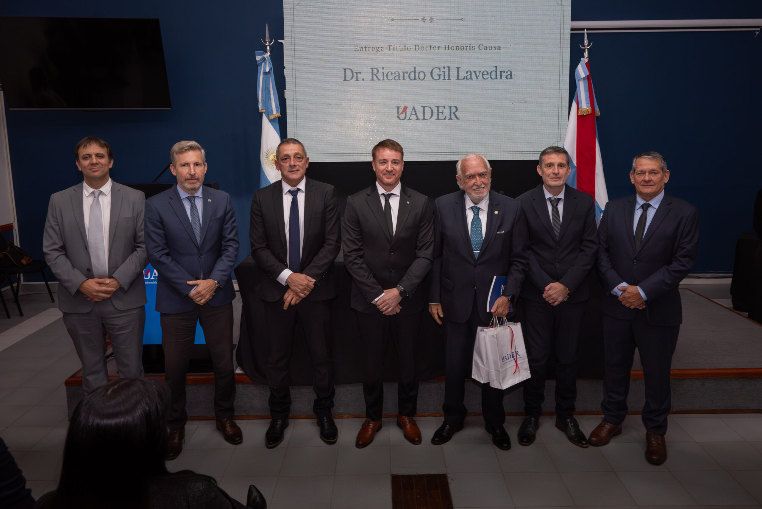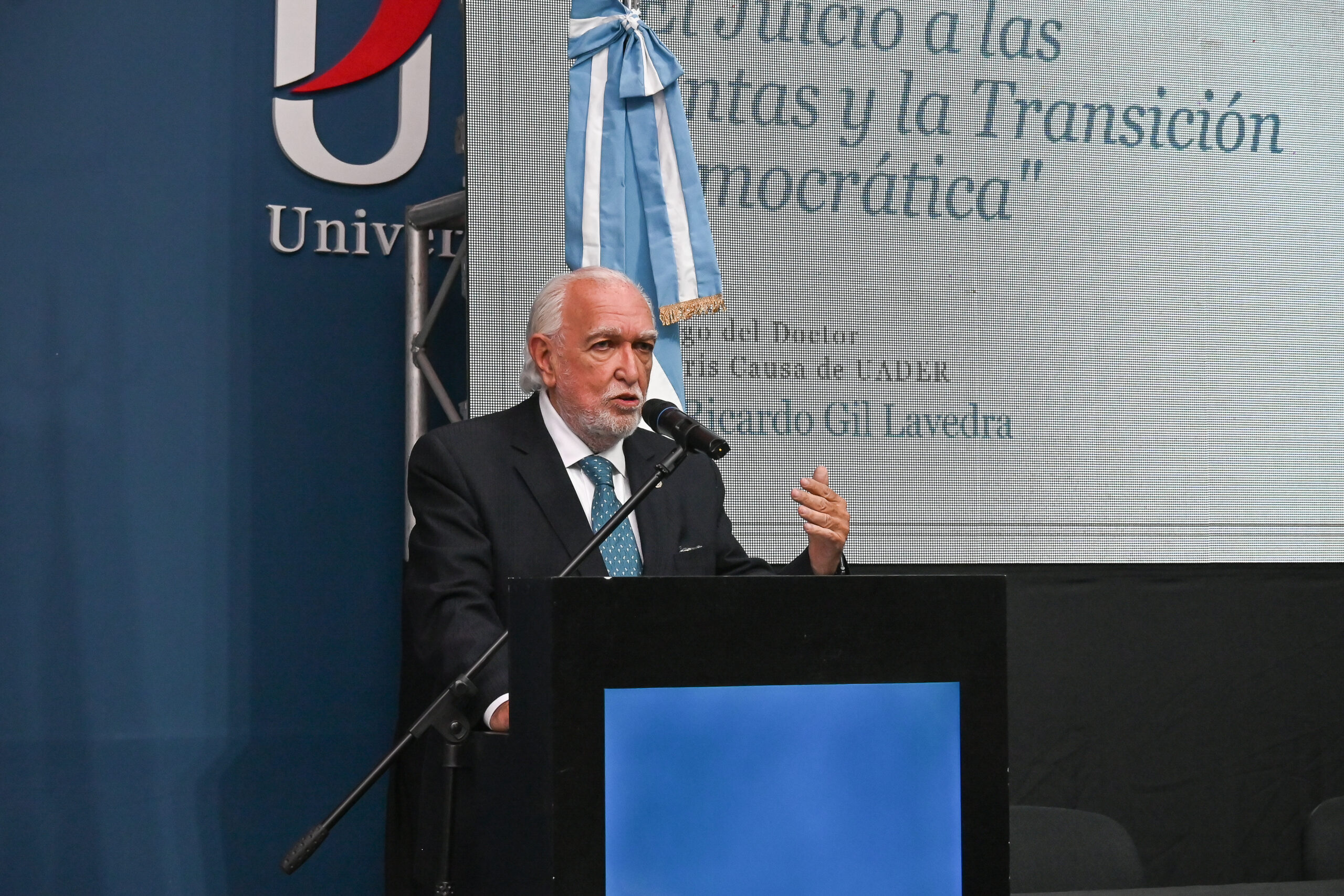 La ceremonia tuvo lugar en el Auditorio Amanda Mayor del Rectorado de la Universidad ámbito en el cual Gil Lavedra brindó la conferencia magistral “El juicio a las juntas y la transición democrática”, en el marco de un acto encabezado por el rector Luciano Filipuzzi y el gobernador de la provincia, Rogelio Frigerio.