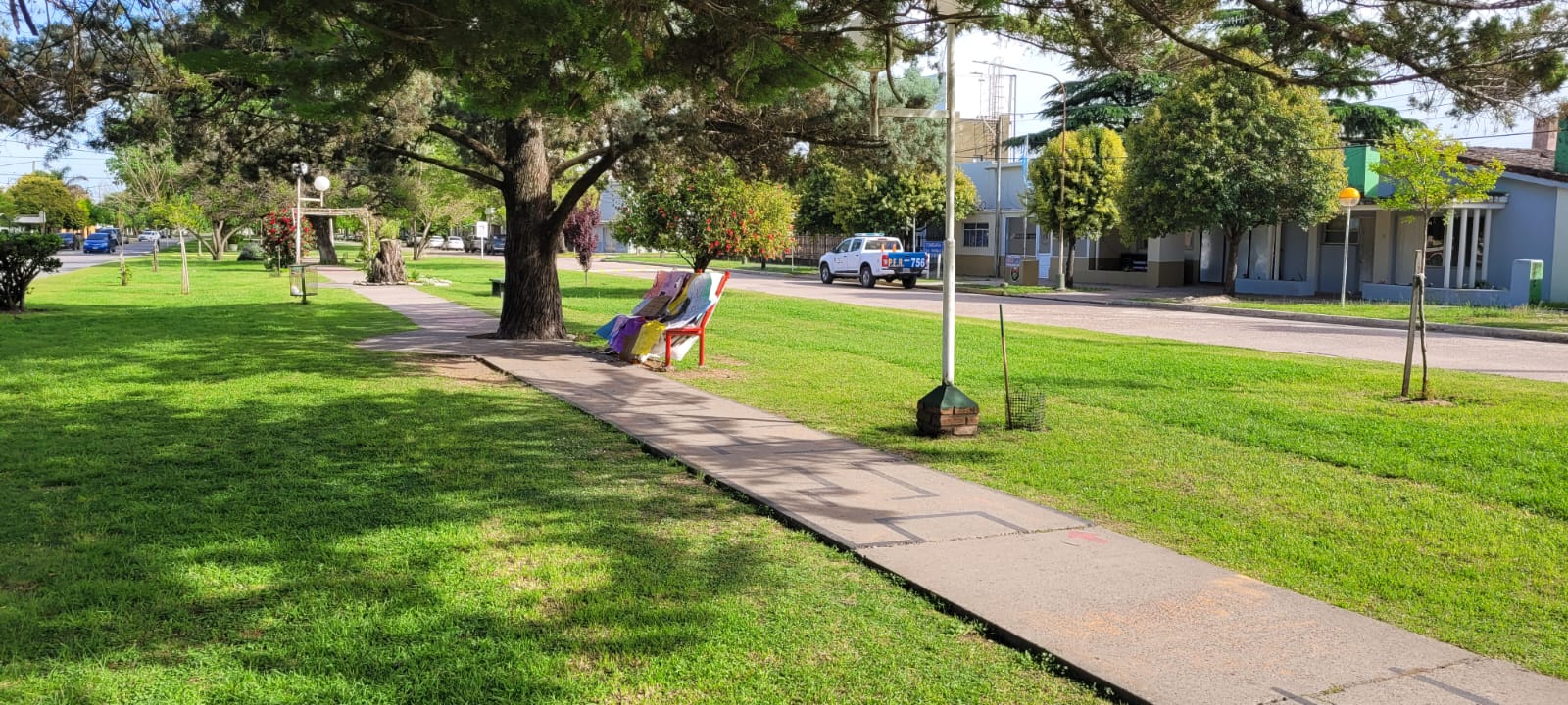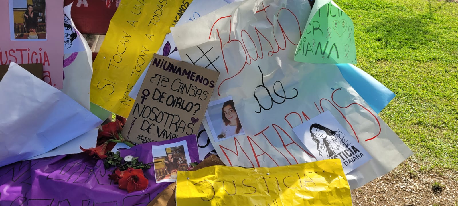 El banco rojo ubicado en el cantero central de Avenida San Martín –un símbolo contra la violencia de género- está cubierto de carteles, y frases  y la foto de Daiana Magalí Mendieta. “Daiana, que tus asesinos no vuelvan a ver la luz del sol”.