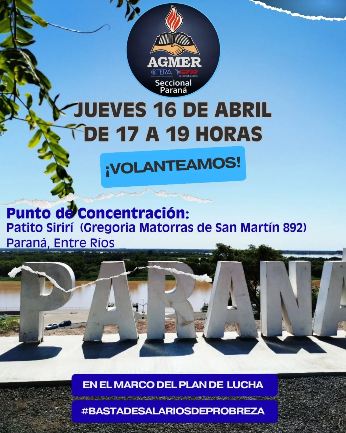 La seccional Paraná de la Asociación Gremial del Magisterio de Entre Ríos (Agmer) se suma a la jornada de proteseta que hará el gremio en toda la provincia con una manifestación en la zona del Patito Sirirí. Se hará entre las 17 y las 19.