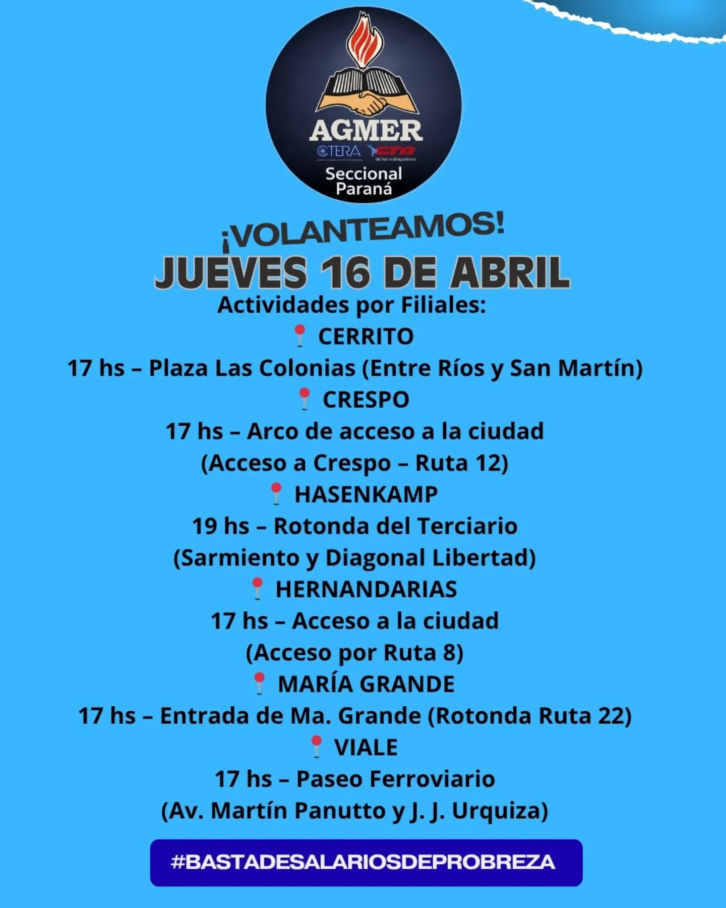«Concentramos en los accesos de cada localidad entrerriana», dice la convocatoria, que plantea en sus demandas que «la educación no se ajusta», reclama un «urgente aumento salarial», y rechaza la «reforma jubilatoria».