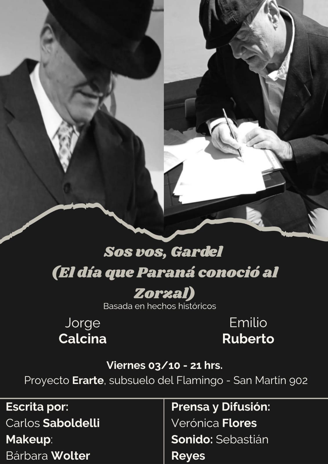 La obra “Sos vos, Gardel (El día que Paraná conoció al Zorzal)” tendrá una segunda función. Será este viernes 10, a las 21, en el subsuelo del Flamingo (Urquiza y Peatonal. Por reserva de entradas, al 3434808780.
