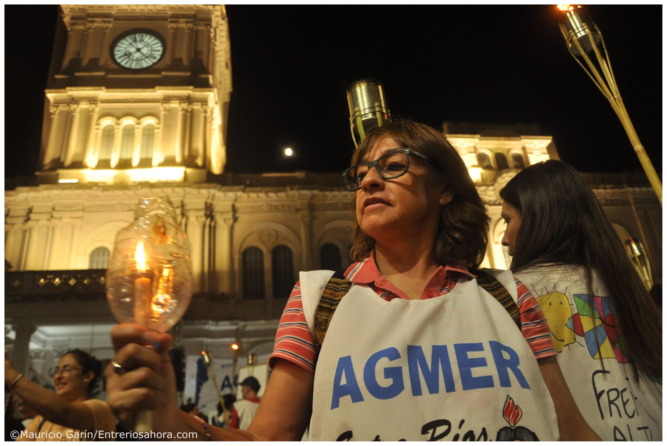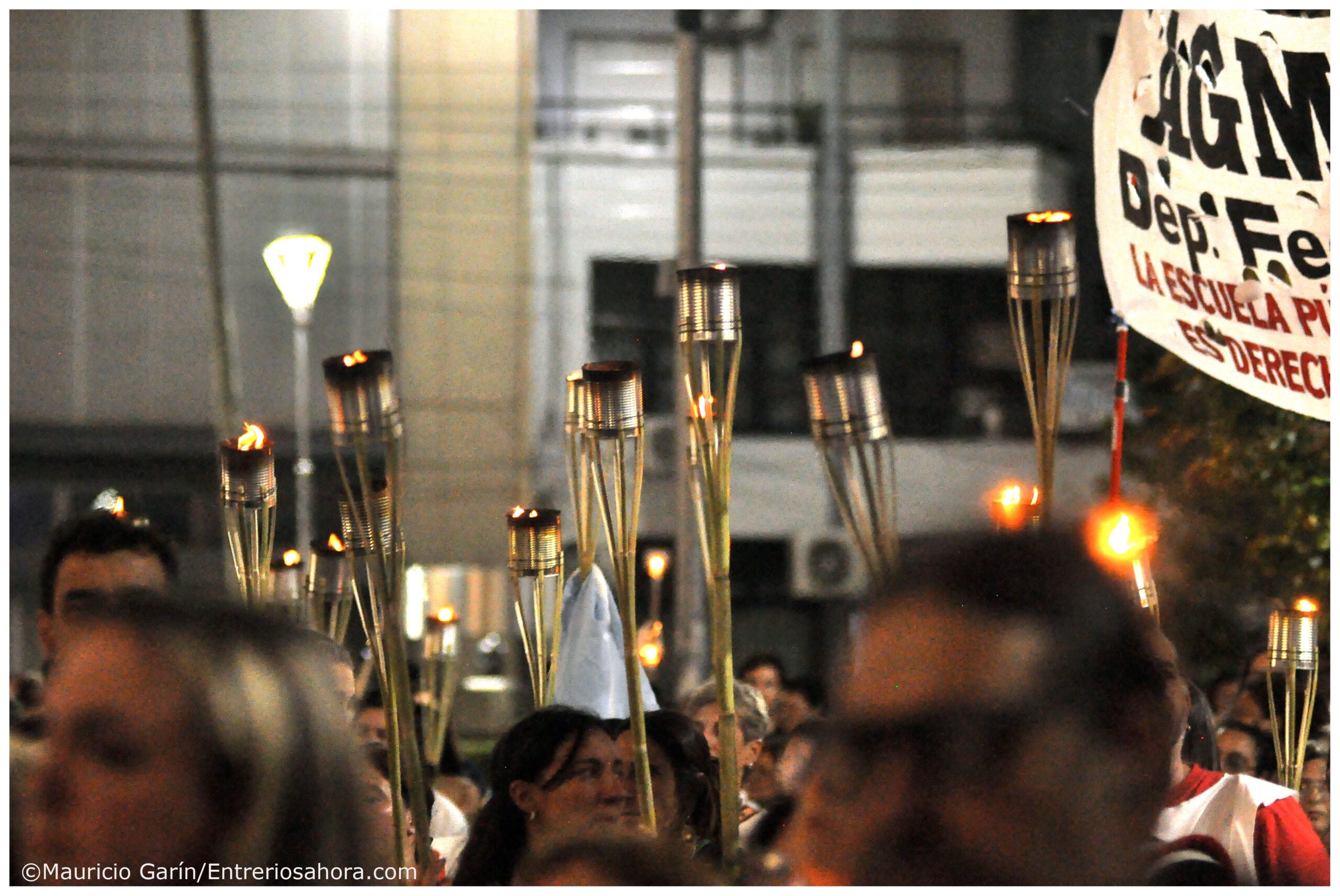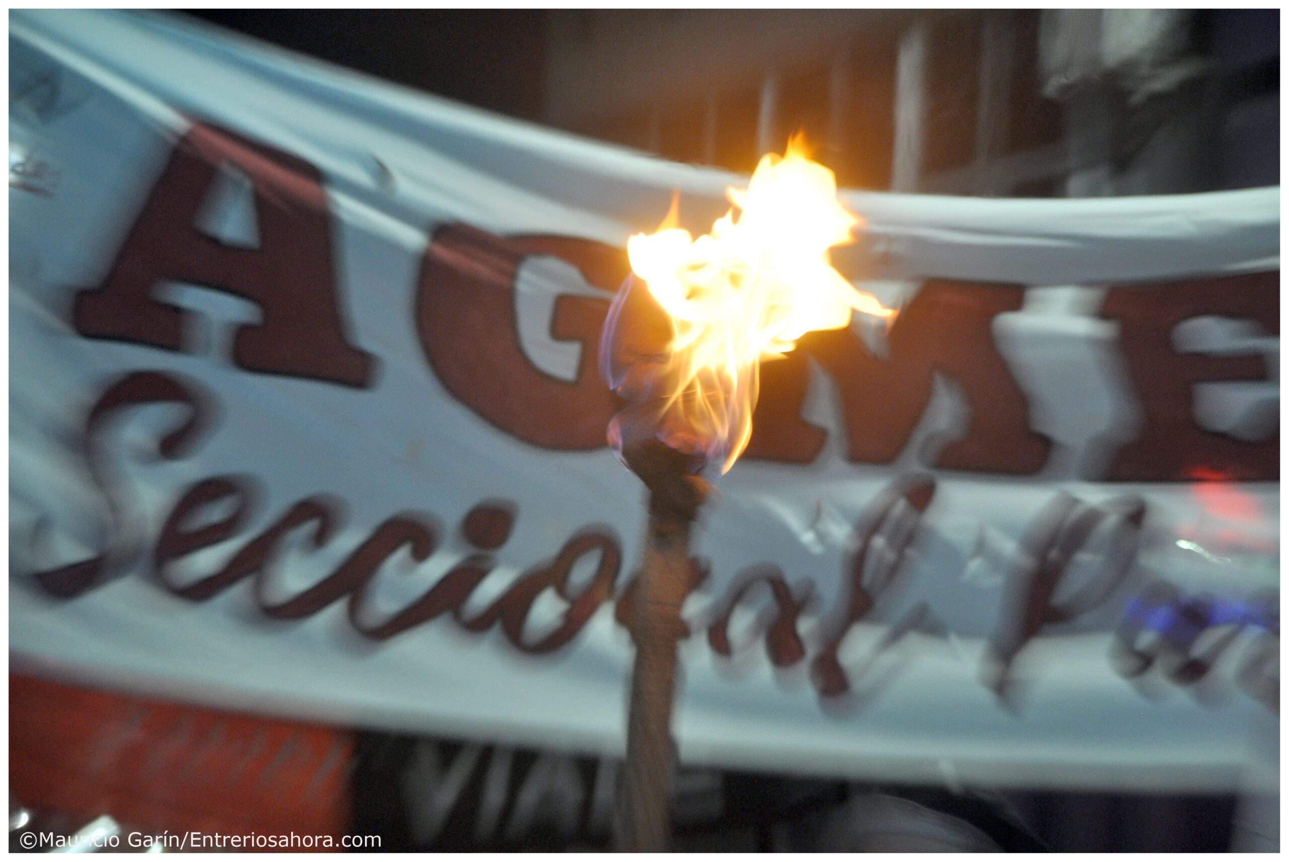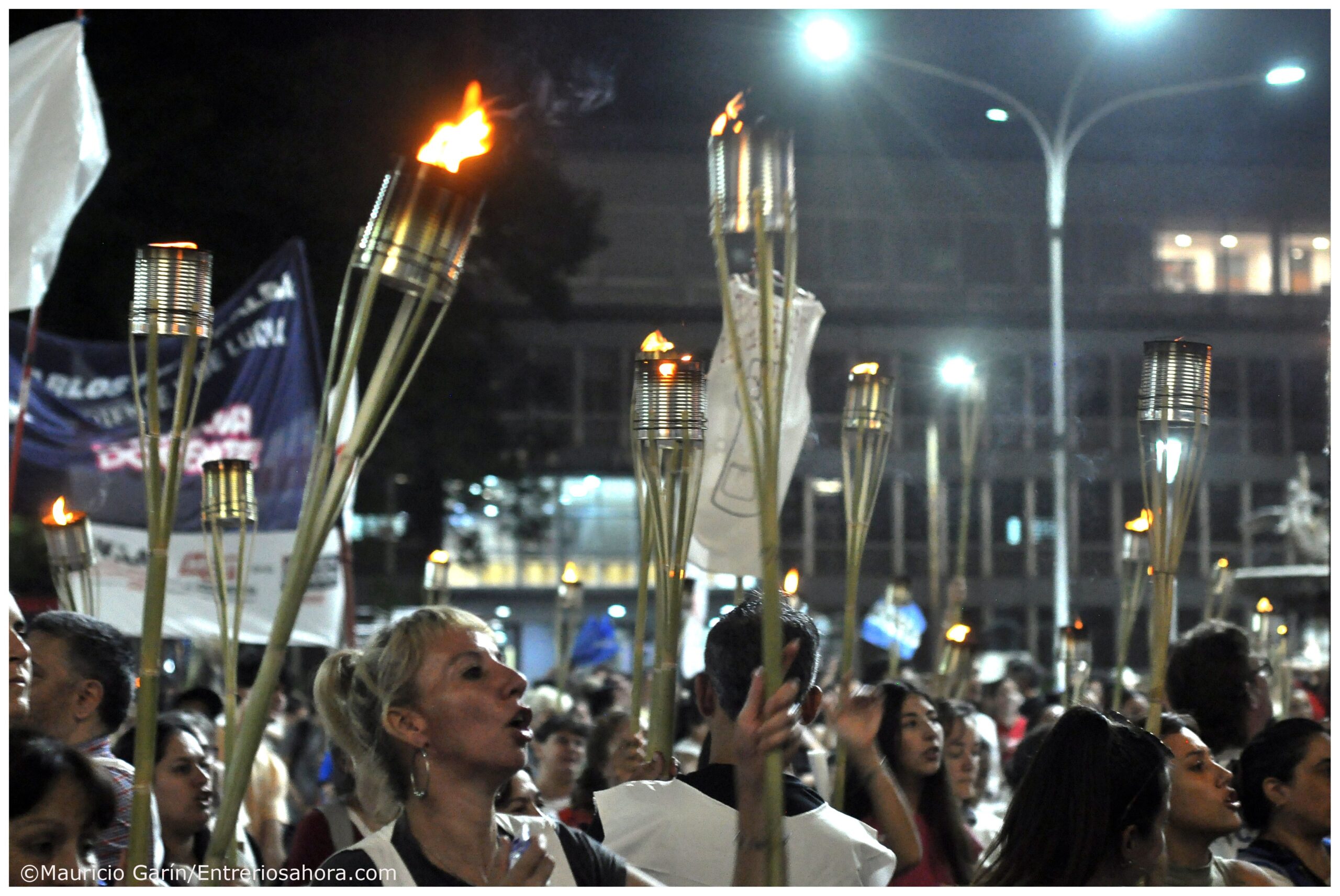 La marcha de antorchas que convocó la Asociación Gremial del Magisterio de Entre Ríos (Agmer) se convortió así en la mayor expresión de malestar hacia el Gobierno. Los docentes rechazan el aumento que el Poder Ejecutivo dispuso por decreto, el 3 de marzo, $60 mil para los activos, y $30 mil para los pasivos, montos no remuerativos y no bonificables. En negro.