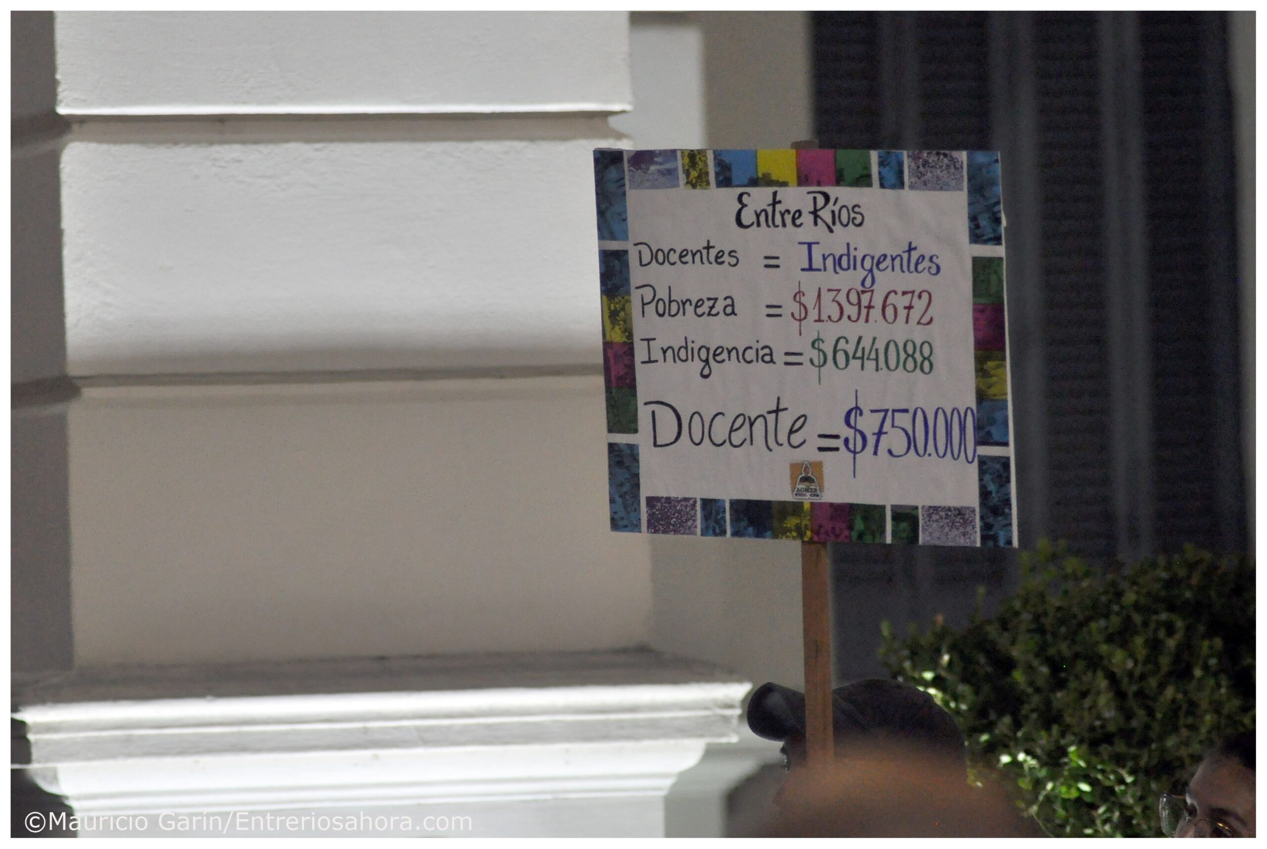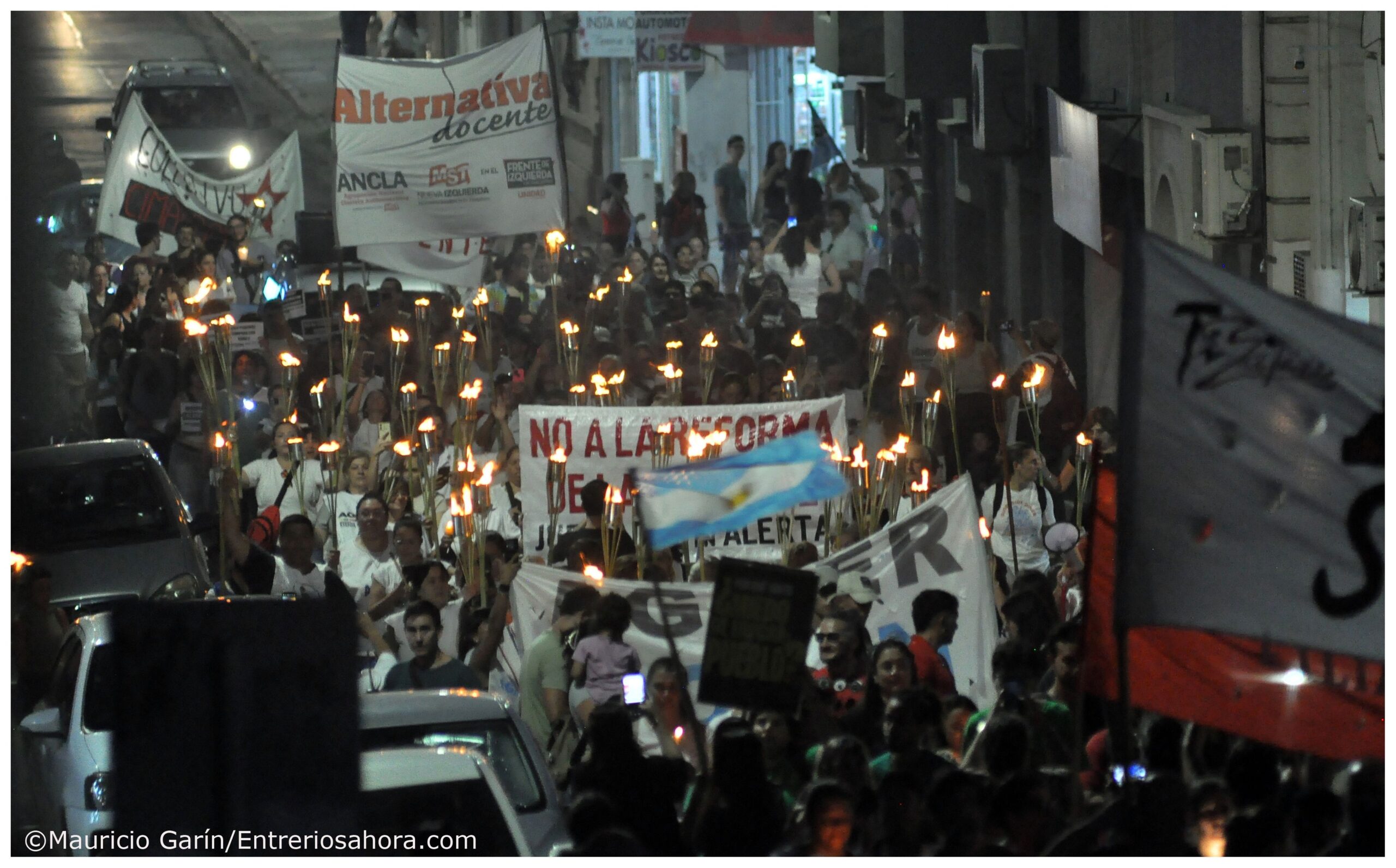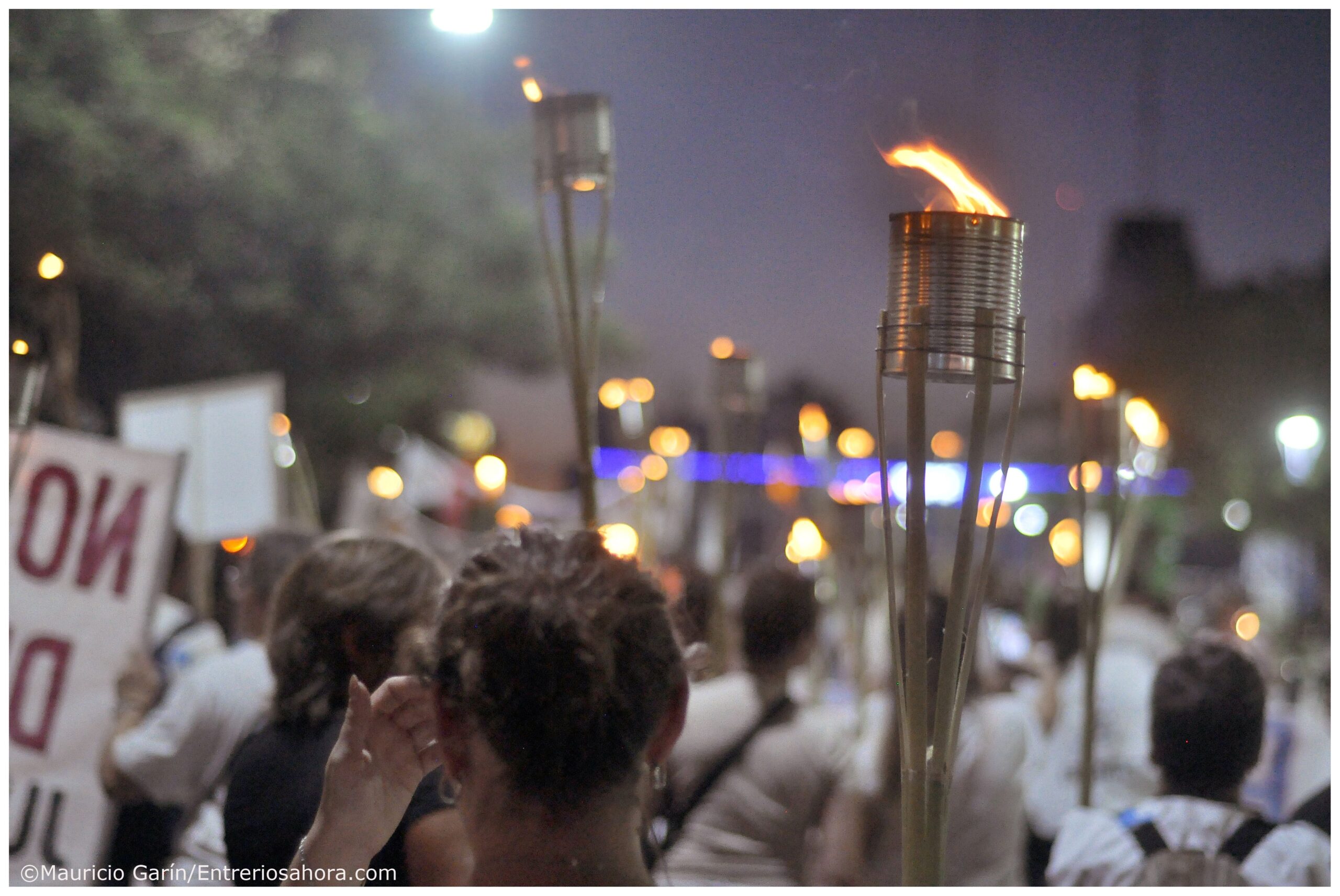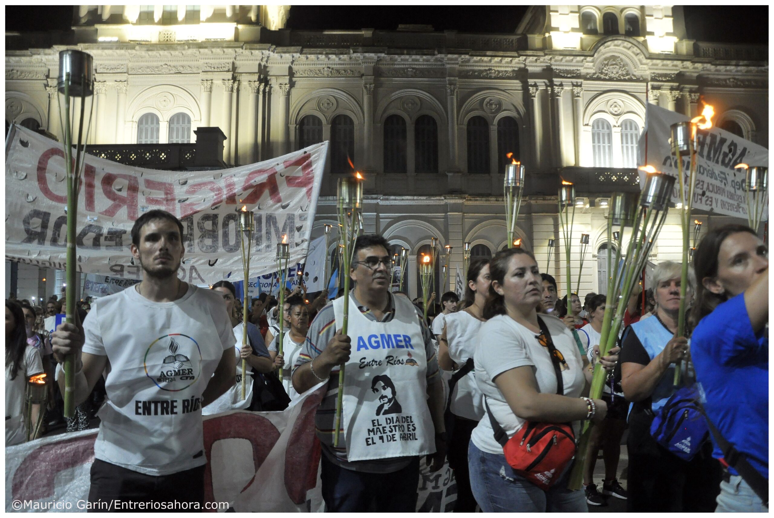 La marcha de antorchas que convocó la Asociación Gremial del Magisterio de Entre Ríos (Agmer) se convortió así en la mayor expresión de malestar hacia el Gobierno. Los docentes rechazan el aumento que el Poder Ejecutivo dispuso por decreto, el 3 de marzo, $60 mil para los activos, y $30 mil para los pasivos, montos no remuerativos y no bonificables. En negro.