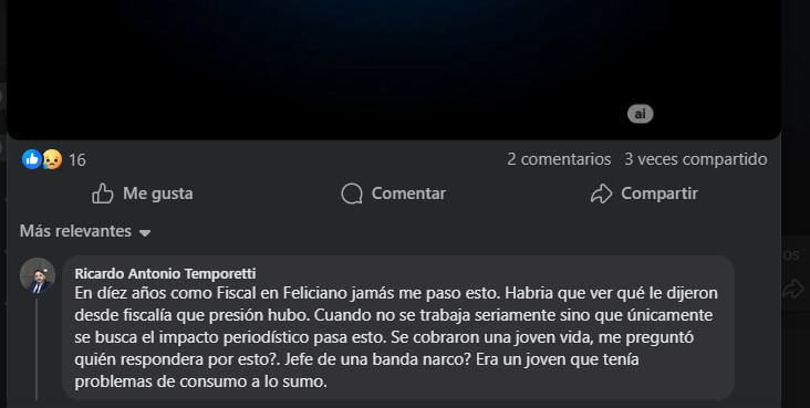 Ricardo Temporetti, exfiscal en Feliciano, opinó sobre el caso. «En diez años como Fiscal en Feliciano jamás me pasó esto. Habría que ver qué le dijeron desde Fiscalía, qué presión hubo. Cuando no se trabaja seriamente sino que únicamente se busca el impacto periodístico, pasa esto. Se cobraron una joven vida, me preguntó quién responderá por esto? Jefe de una banda narco? Era un joven que tenía problemas de consumo, a lo sumo».