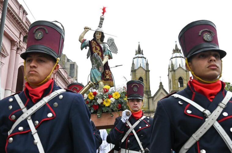 El arzobispo de Paraná, Raúl Martín, presidió este lunes 29 la fiesta del patrono de Entre Ríos San Miguel. La celebración, que se desarrolló en la parroquia San Miguel, incluyó procesión, misa y luego la actuación de la Banda de Música de la Policía de Entre Ríos. La veneración a San Miguel nació en esta provincia casi con la conquista misma de estas tierras por parte de los españoles. Fueron los jesuitas de la Compañía de Jesús quienes diseminaron su devoción, al punto que aquí fundaron la estancia San Miguel. Aunque la elección de San Miguel como patrono de Entre Ríos y de la Virgen del Rosario como patrona de Paraná no fue una tarea sencilla, y para resolver ese diferendo la feligresía debió concurrir a las urnas, en acto público, frente a la Iglesia Catedral, en Plaza 1º de Mayo. Corría entonces el año 1825. En uno y otro bando se anotaron, sucesivamente, los distintos párrocos que tuvo la ciudad. Antolín Gil y Obligado, uno de ellos, fue un ferviente devoto de San Miguel, y a su abnegada tarea se debe la erección de la capilla en su honor, un edificio construido hacia el año 1822. Pero como entonces los cambios políticos que ocurrían en la provincia influían en la vida eclesiástica, con la asunción del mando militar de José Eusebio Hereñú se produce la expulsión de Gil y Obligado, y la llegada como vicario del sacerdote Francisco Dionisio Alvarez, quien, en contraposición, era devoto de la Virgen del Rosario. Fue precisamente el cura Alvarez quien procuraría salvar las divisiones que entonces se producían entre la feligresía entre los devotos de San Miguel y de la Virgen del Rosario. El clérigo, incluso, consiguió la venia del Gobierno para llevar adelante la elección que, “para hacerse según derecho, debe hacerse en una arca cerrada y otros requisitos que la dicha reunión será instruida”. Las crónicas cuentan que la votación se llevó a cabo el 1º de enero de 1825 y el arca cerrada -donde se emitieron los votos-, se depositó en el aljibe de la cisterna de agua que existía en la plaza principal. Los sufragantes no eran, sin embargo, sólo los habitantes de Paraná; también votaron los habitantes de La Matanza (hoy ciudad de Victoria) y Alcaraz. El resultado fue que la Virgen del Rosario logró imponerse en la votación para ser patrona de la ciudad de Paraná y San Miguel pasó a ser patrono de Entre Ríos.