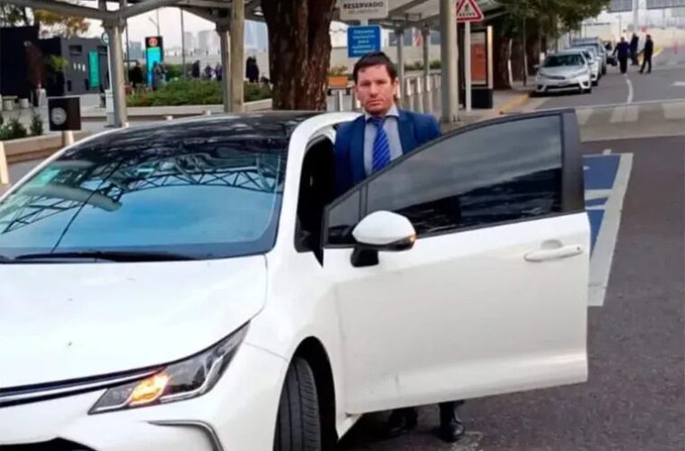 En las imágenes se observa cómo el hombre se acerca al vehículo, saluda con un beso al chofer, intercambia breves palabras y procede a guardar sus pertenencias en el baúl del Toyota. Los movimientos son tranquilos y denotan que ambos se conocían, o al menos mantenían una relación de confianza suficiente como para compartir un viaje de larga distancia.