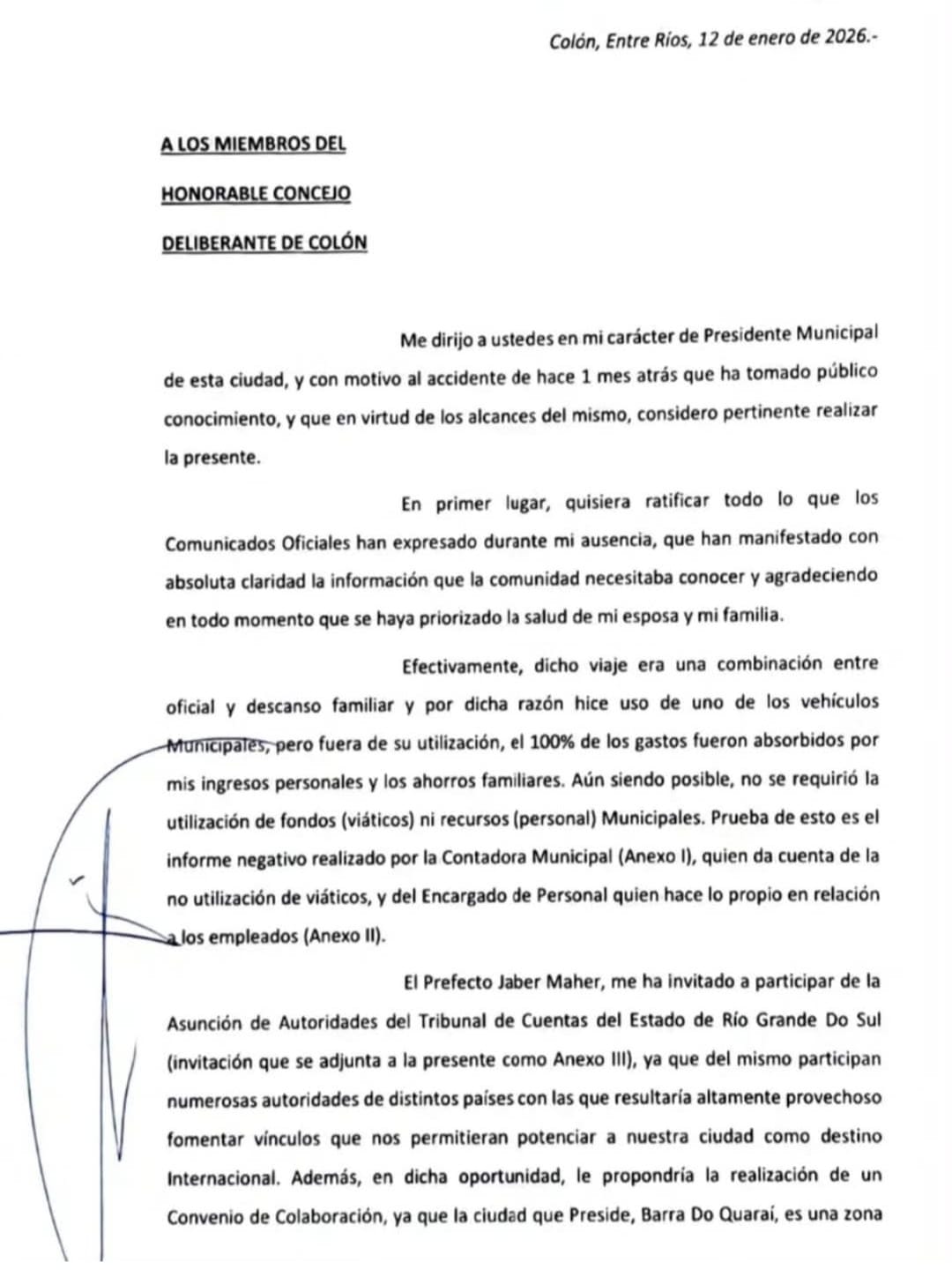 Walser ratificó lo dicho en los comunicados oficiales brindados por la Municipalidad de Colón durante el tiempo que estuvo en Brasil con su esposa y secretaria privada, Gimena Bordet, internada en Terapia Intensiva en el Hospital Cristo Redentor de Porto Alegre. Dice en el informe al Concejo que esas comunicaciones “han manifestado con claridad la información que la comunidad necesitaba conocer y agradeciendo en todo momento que se haya priorizado la salud de mi esposa y mi familia”.