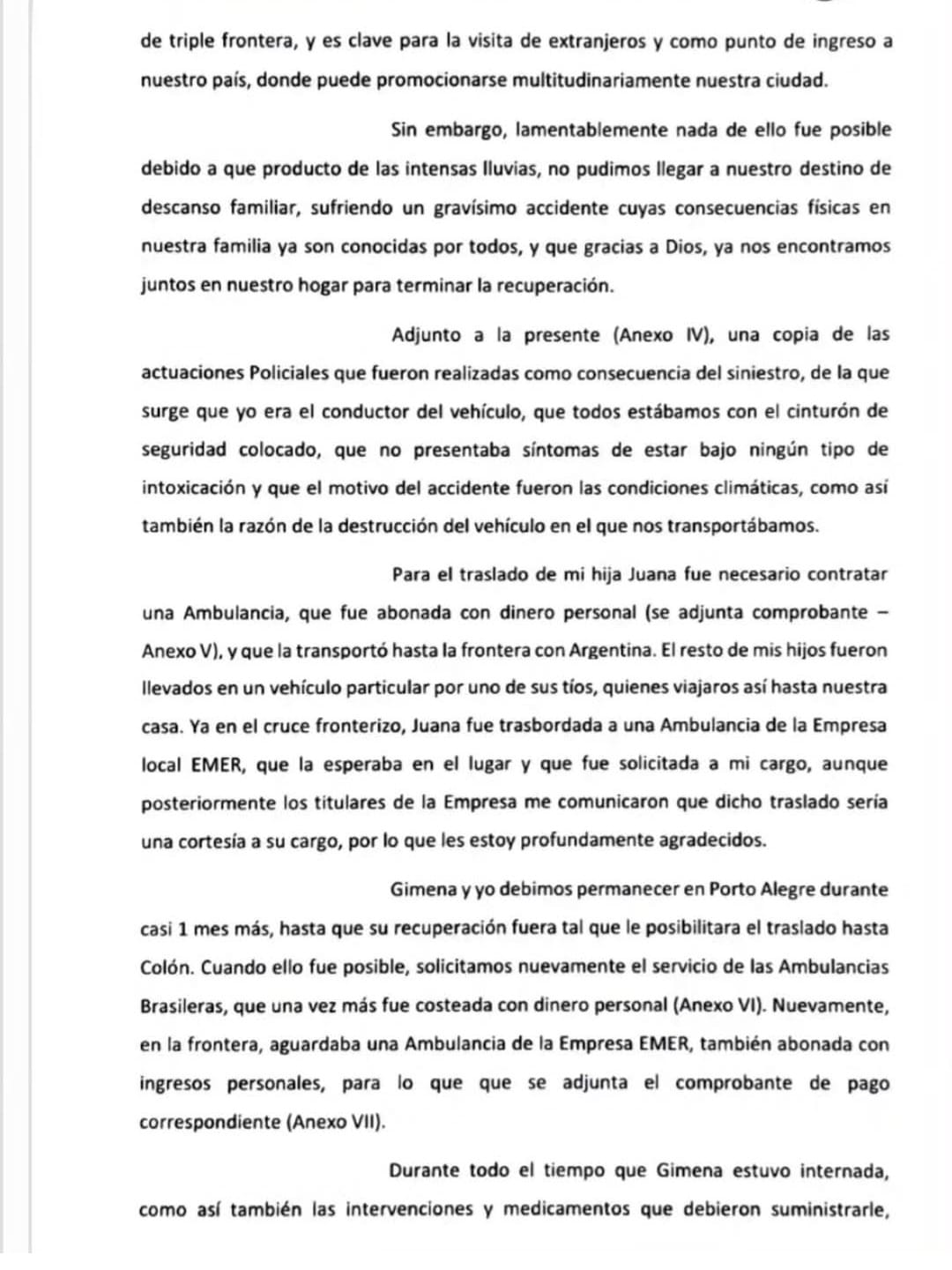 Más adelante, señala: “Gimena y yo debimos permanecer en Porto Alegre durante casi 1 mes más, hasta que su recuperación fuera tal que le posibilitara el traslado hasta Colón. Cuando ello fue posible, solicitamos nuevamente el servicio de las ambulancias brasileras, que una vez más fue costeada con dinero personal (…). Nuevamente, en la frontera, aguardaba una ambulancia del a empresa EMER, también abonaba con ingresos personales”.