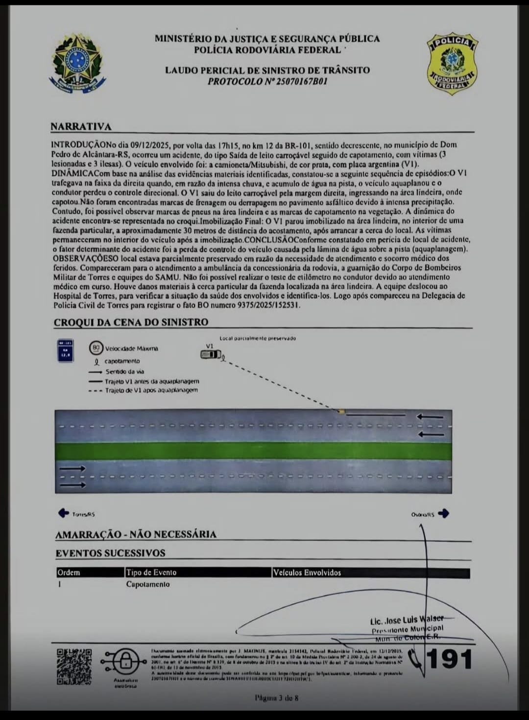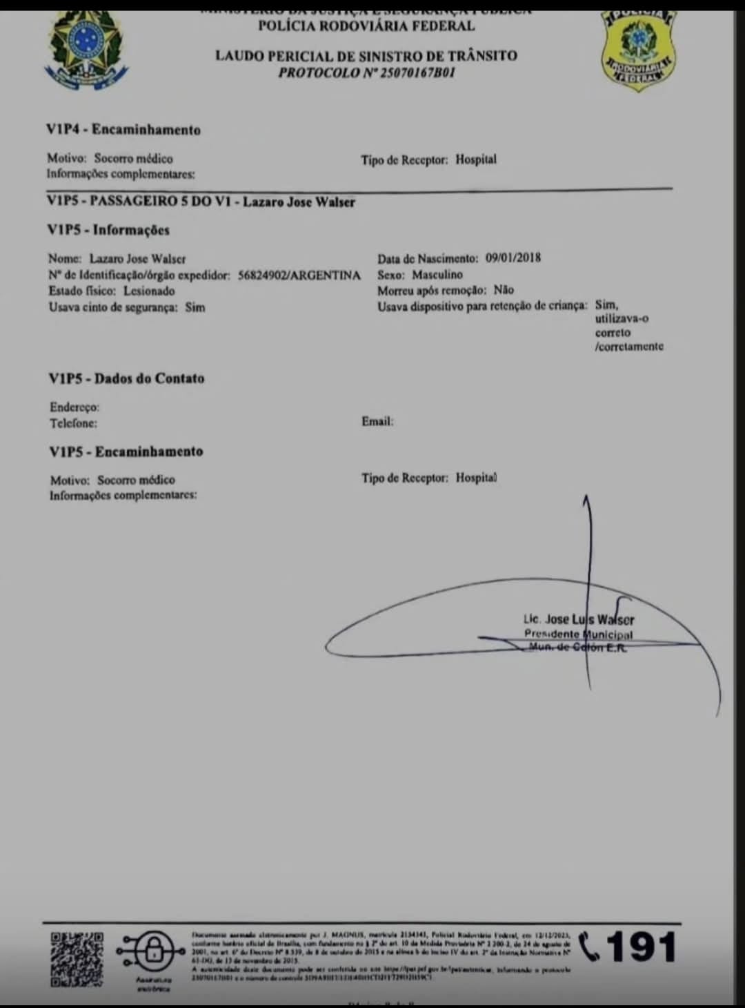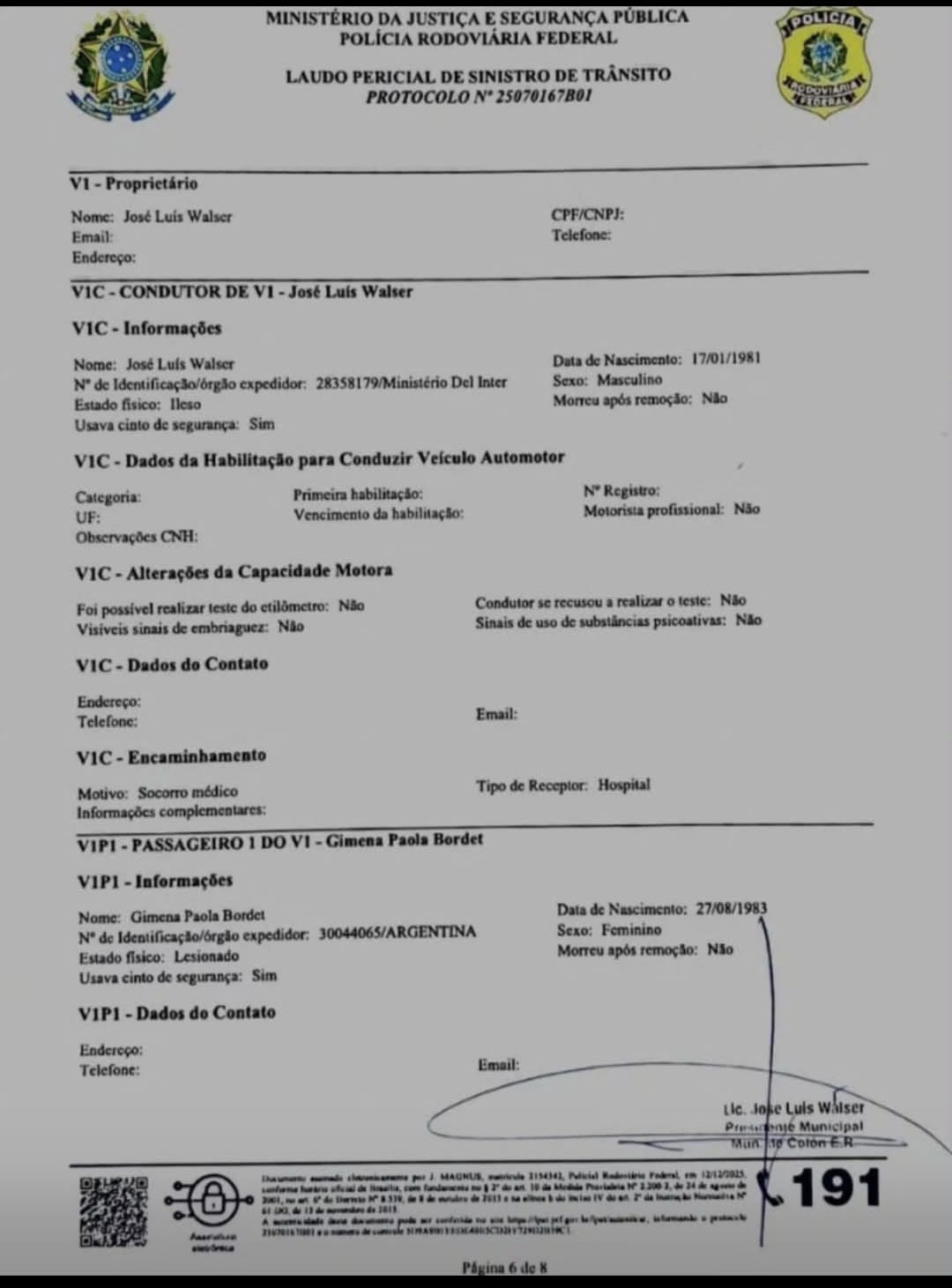 El intendente de Colón, el vecinalista José Luis Walser, elevó el lunes 12 un informe al Concejo Deliberante de la ciudad “con motivo al accidente de hace 1 mes atrás que ha tomado público conocimiento y que en virtud de los alcances del mismo considero pertinente realizar la presente”.