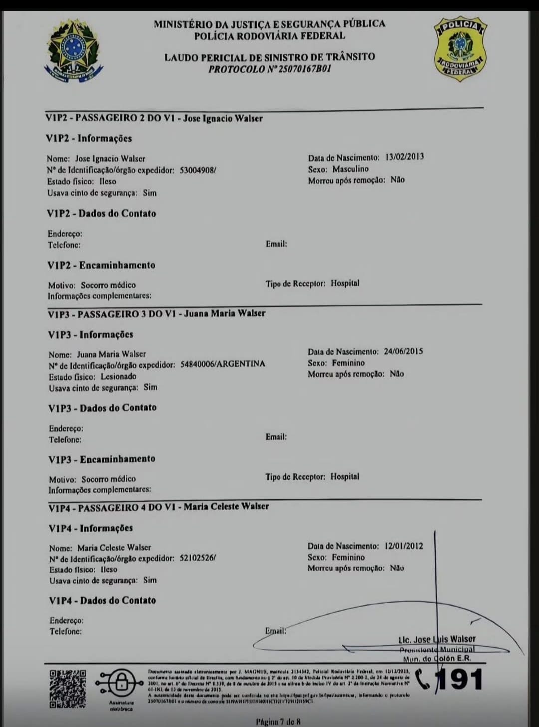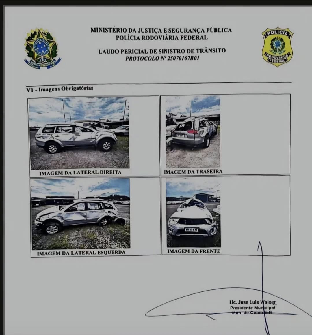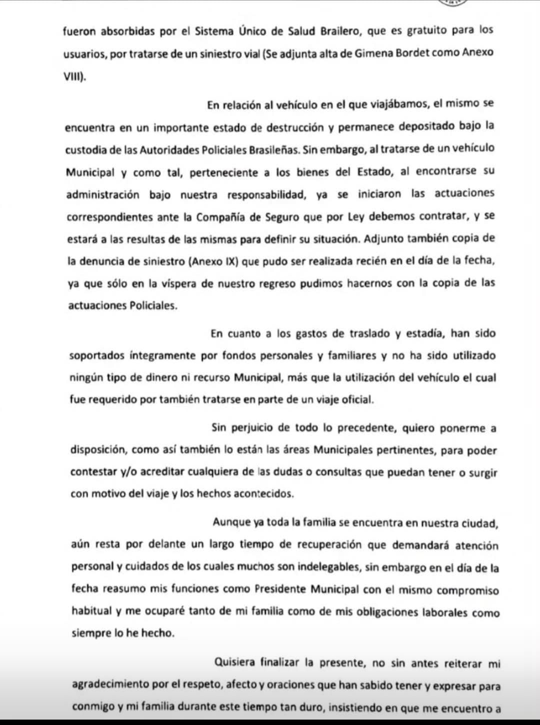 Respecto del vehículo oficial Mitsubishi Dakar en el que la familia Walser Bordet viajó a Brasil, señala que “el mismo se encuentra en un importante estado de destrucción y permanece depositado bajo la custodia de las autoridades policiales brasileñas. Sin embargo, al tratarse de un vehículo municipal y como tal perteneciente a los bienes del Estado, al encontrarse su administración bajo nuestra responsabilidad ya que se iniciaron las actuaciones correspondientes ante la Compañía de Seguro que por ley debemos contratar, y se estará a las resultas de las mismas para definir su situación”.