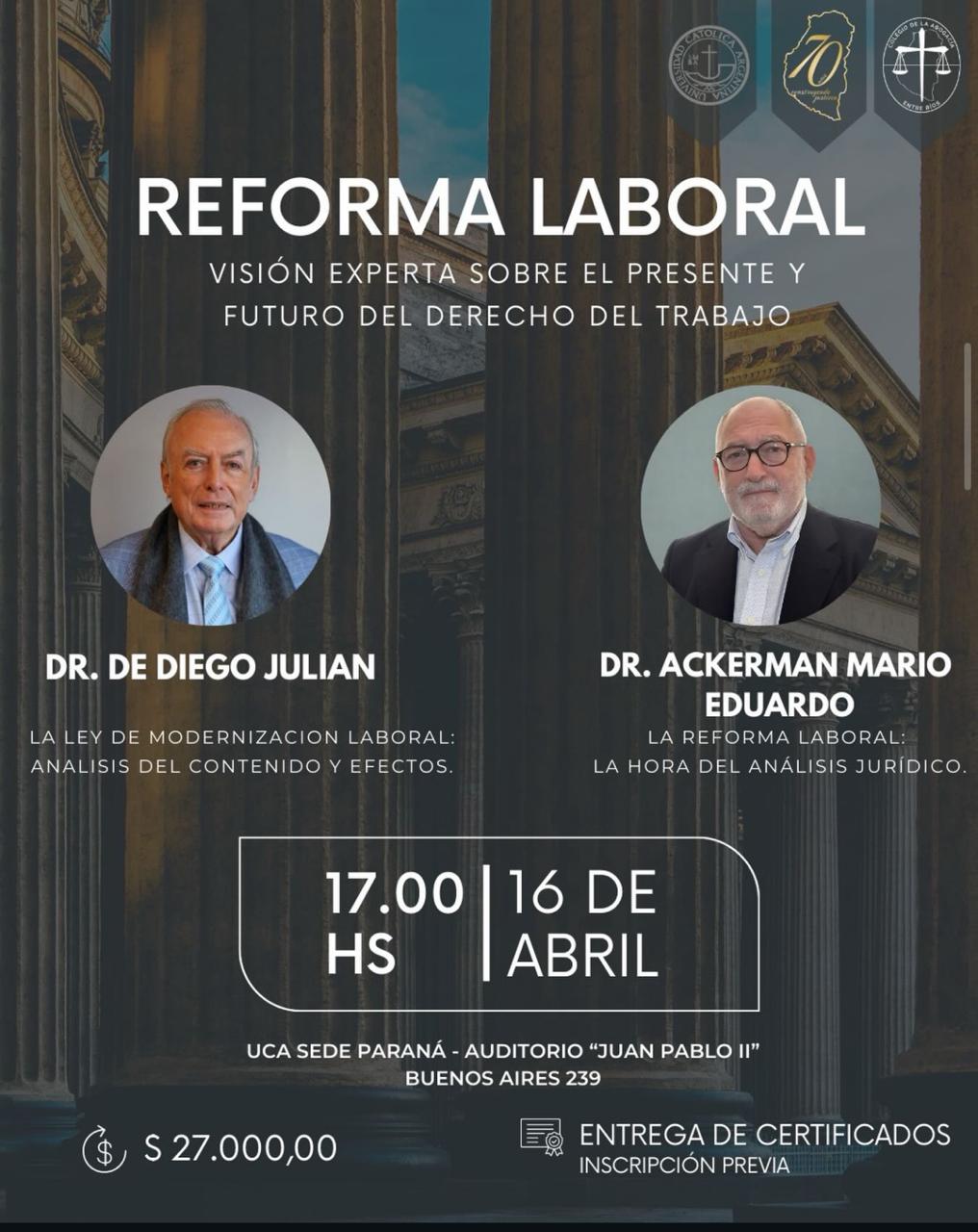 El Colegio de la Abogacía de Entre Ríos organizó una disertación de dos especialistas que vendrán a Paraná a dar su visión sobre la Reforma Laboral, recientemente aprobada en el Congreso.