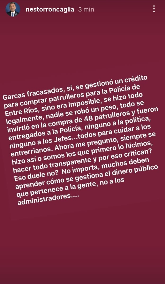 La respuesta no se hizo esperar. A través de una historia en su cuenta de Instagram, Roncaglia le respondió sin nombrarlo. “Garcas fracasados, sí, se gestionó un crédito para comprar patrulleros para la Policía de Entre Ríos, si no era imposible, se hizo todo legalmente, nadie se robó un peso, todo se invirtió en la compra de 48 patrulleros y fueron entregados a la policía, ninguno a la política, ninguno a los jefes, todos para cuidar a los entrerrianos. Ahora, me pregunto, siempre se hizo así o somos los que primero lo hicimos, hacer todo transparente y por eso critican? Eso duele. no? No importa, muchos deben aprender cómo se gestiona el dinero público que pertenece a la gente, no a los administradores”, publicó el titular del Ministerio de Seguridad.