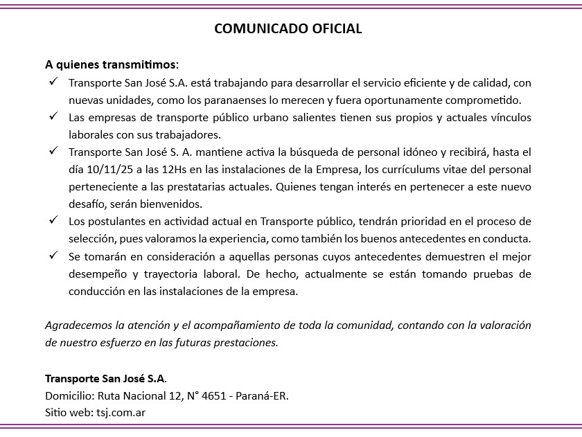 Y agregó: “Las empresas de transporte público urbano salientes tienen sus propios y actuales vínculos laborales con sus trabajadores”. Al respecto, planteó: “Transporte San José SA mantiene activa la búsqueda de personal idóneo y recibirá, hasta el día 10/11/25 a las 12 hs en las instalaciones de la empresa los curriculums vitae del personal perteneciente a las prestatarias actuales. Quienes tengan interés en pertenecer a este nuevo desafío serán bienvenidos”.