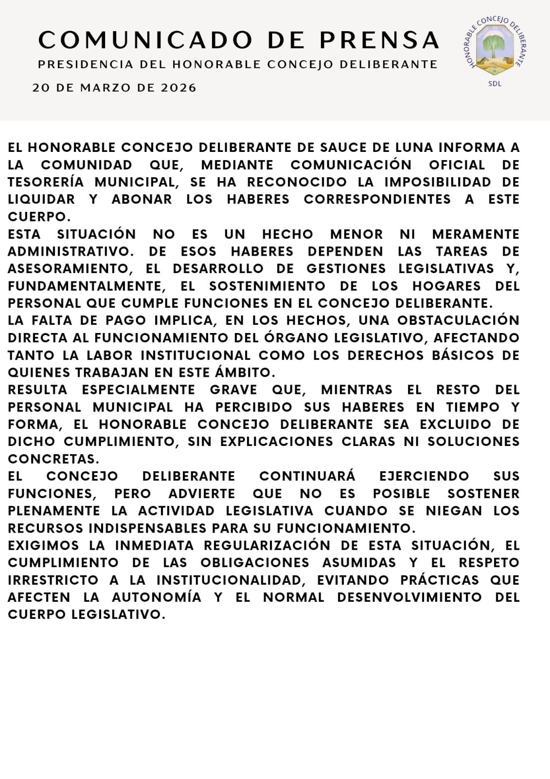 “Resulta especialmente grave que, mientras el resto del personal municipal ha percibido sus haberes en tiempo y forma, el Honorable Concejo Deliberante sea excluido de dicho cumplimiento sin explicaciones claras ni soluciones concretas”, resaltó Zurdo.