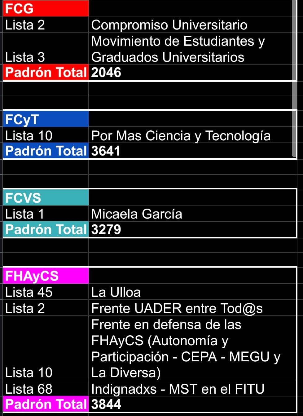 En la Facultad de Humanidades, Artes y Ciencias Sociales competirán 4 listas: “La Ulloa”, “Frente Uader entre Tod@s”, “Frente en defensa de la Facultad de Humanidades (Autonomía y Participación-CEPA-MEGU y La Diversa)” e “Indignadxs-MST en el FITU”.