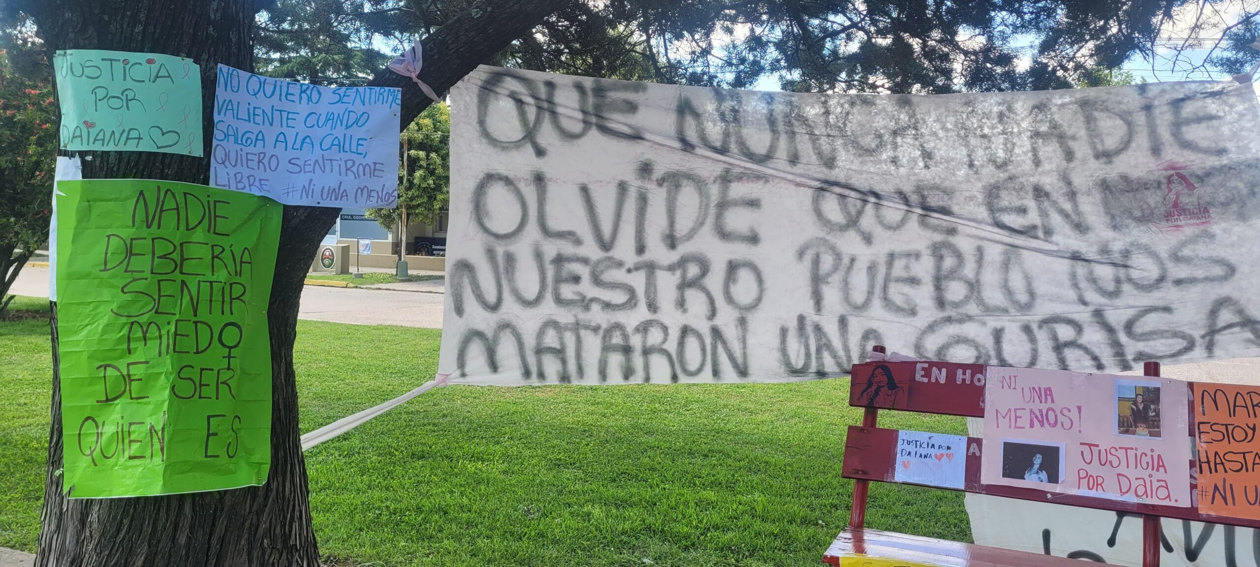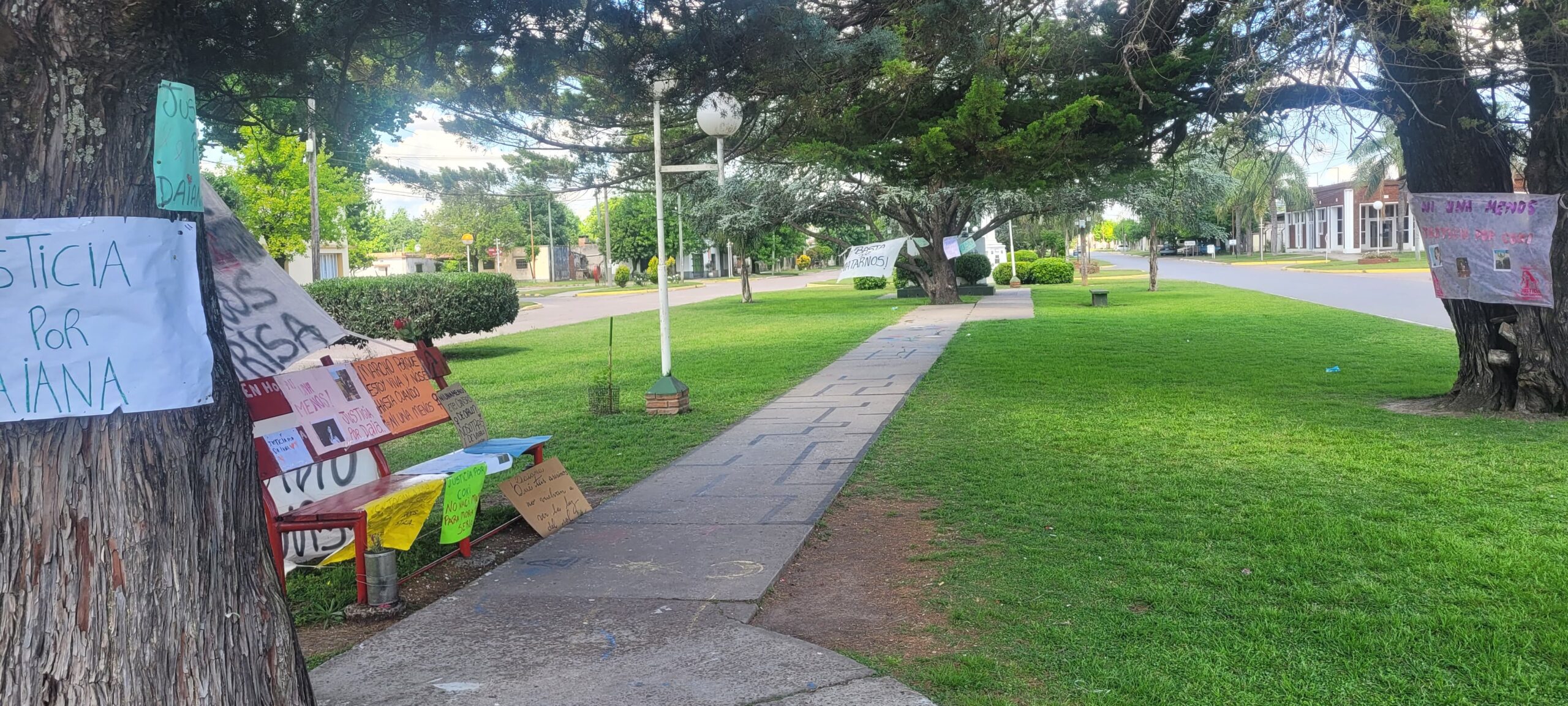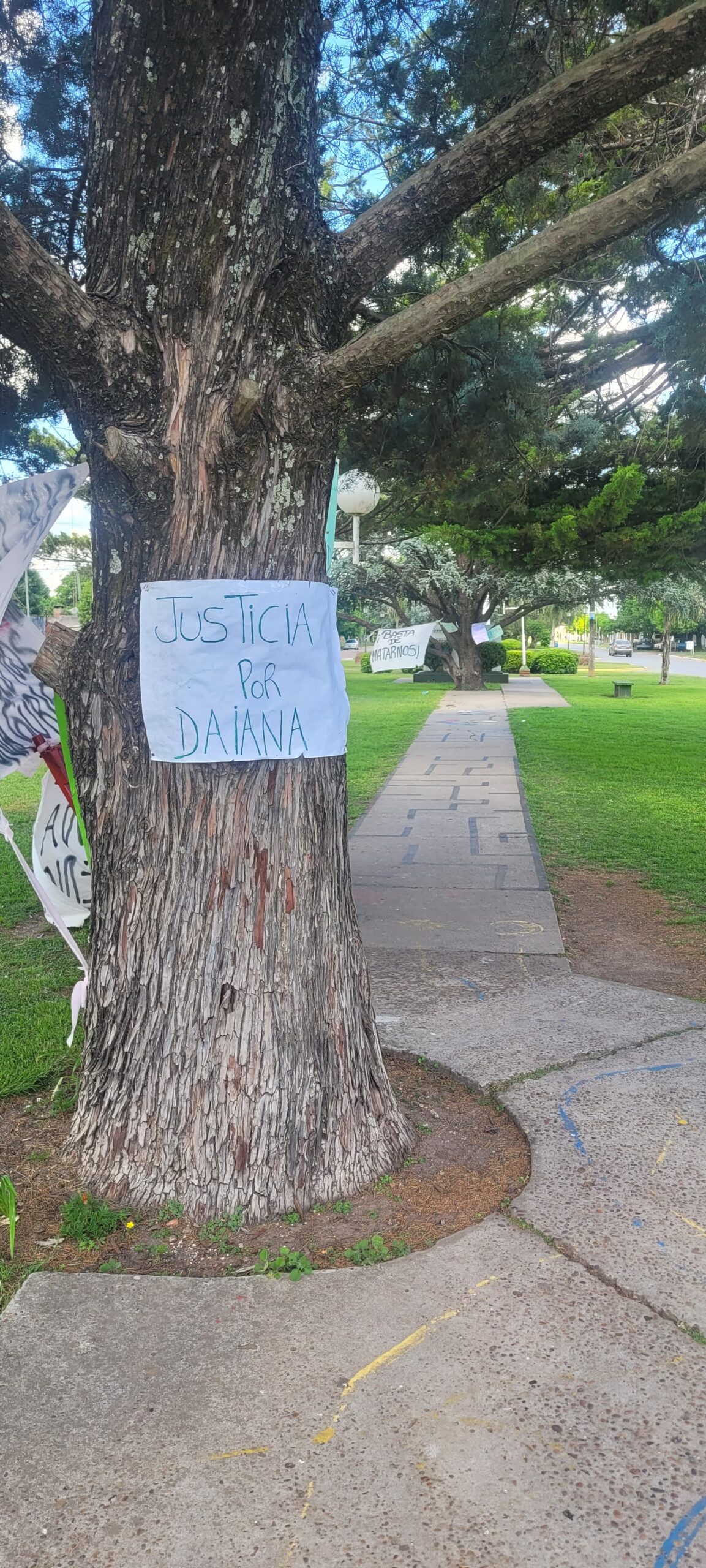 En la plazoleta que bordea la Avenida San Martin hay un cartel escrito sobre una cartulina, pegado el cartel al tronco de un árbol: «Justicia por Daiana». Y otro: «Que nunca nadie olvide que en nuestro pueblo mataron una gurisa».