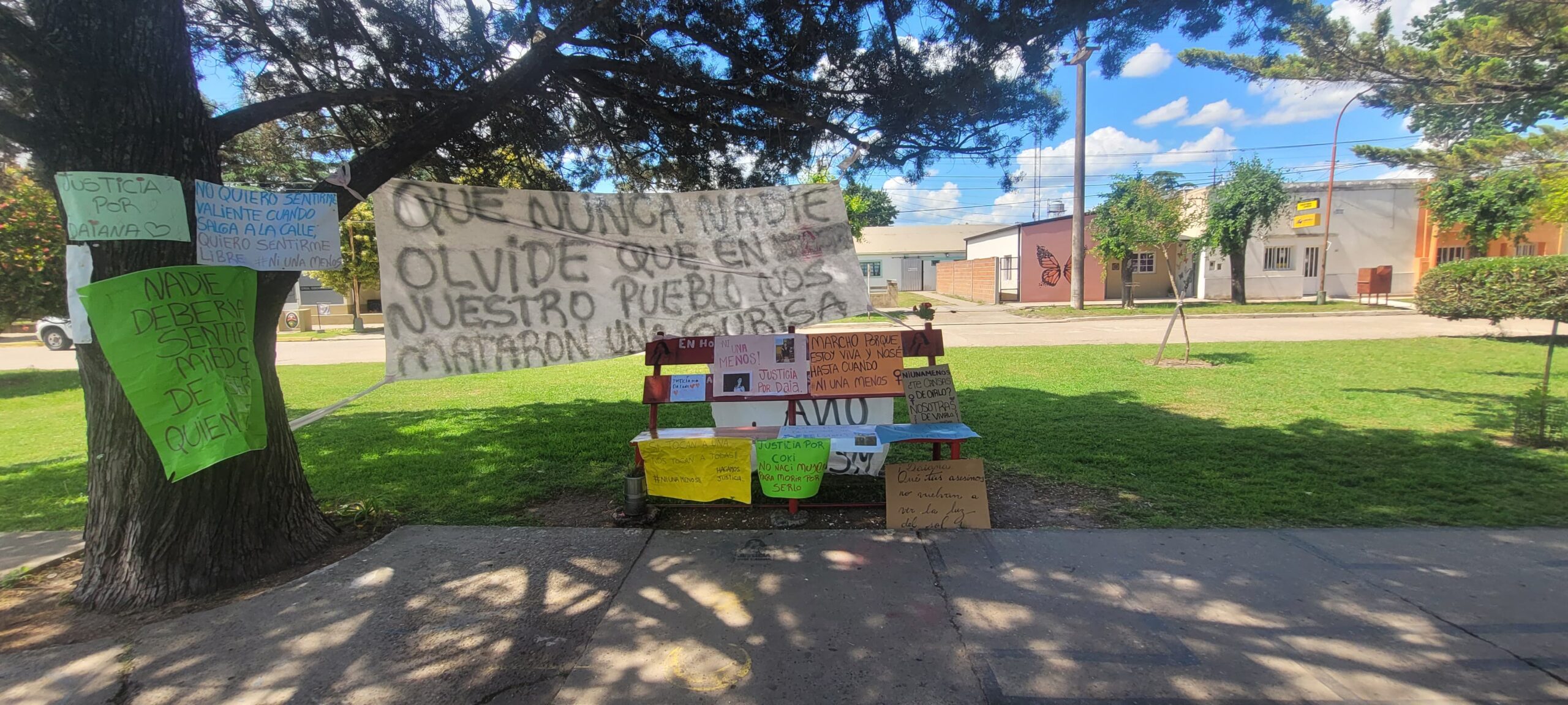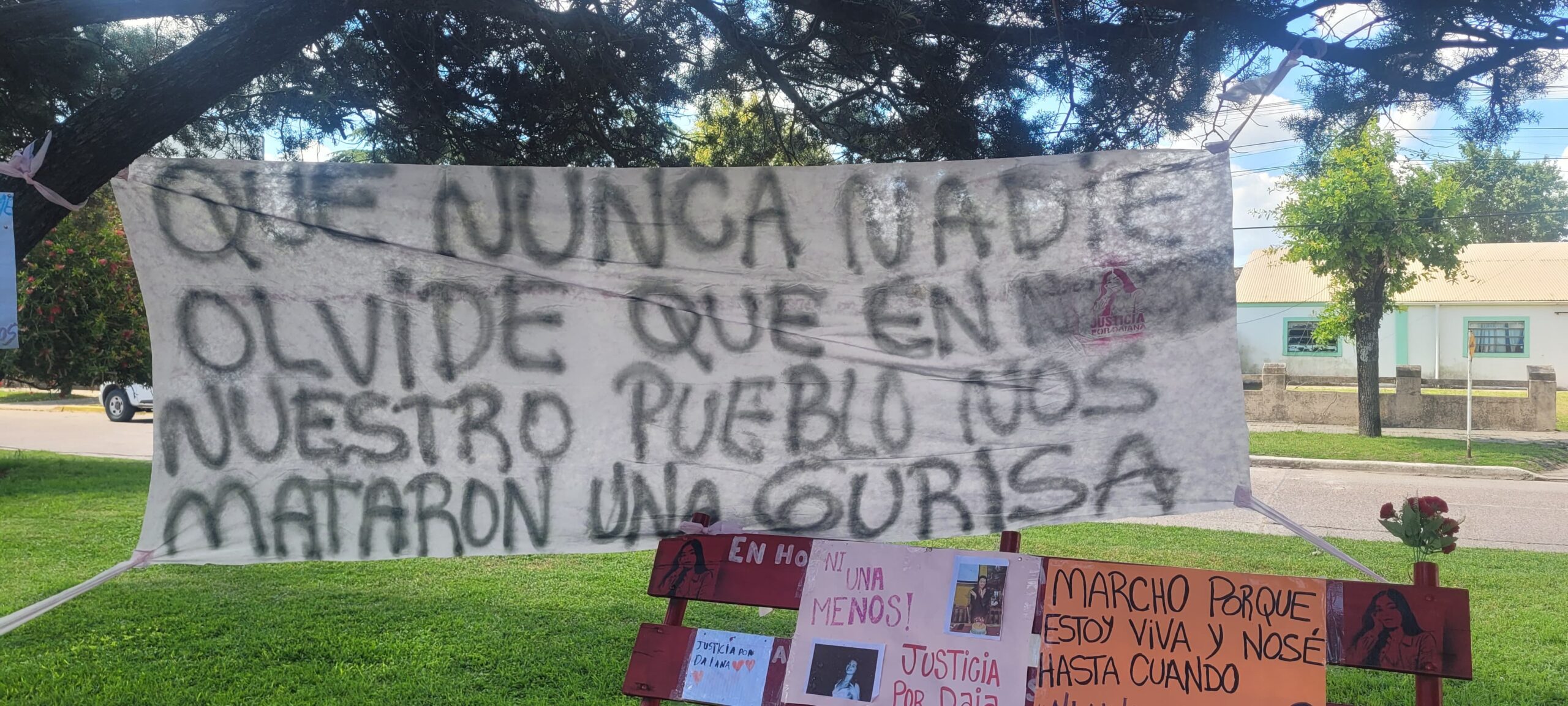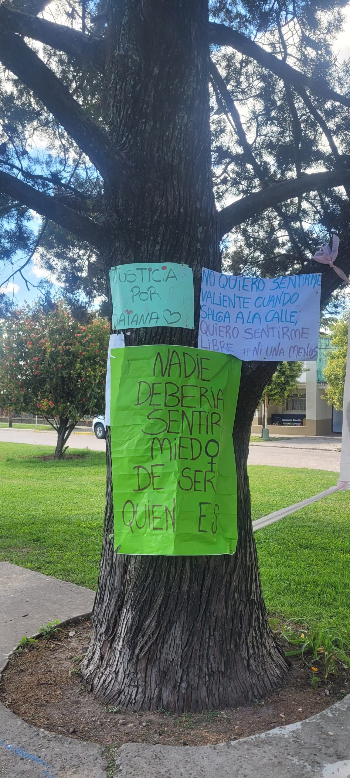 En la plazoleta que bordea la Avenida San Martin hay un cartel escrito sobre una cartulina, pegado el cartel al tronco de un árbol: «Justicia por Daiana». Y otro: «Que nunca nadie olvide que en nuestro pueblo mataron una gurisa».