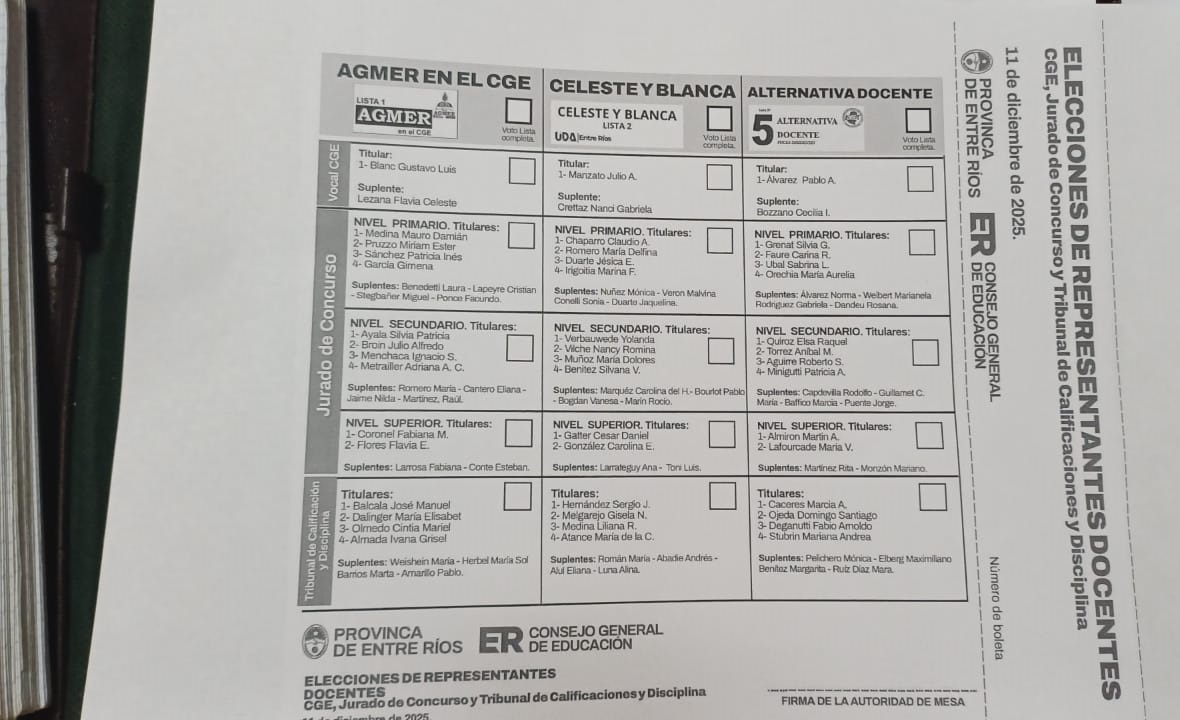 Cabe destacar que el proceso se realizará con Boleta Única de Papel (BUP), conforme a lo establecido por la Ley Nº 11.190 del Código Electoral de la Provincia de Entre Ríos, garantizando así transparencia, participación y equidad en la elección de los representantes docentes. Con este proceso electoral, se fortalecen los espacios de representación y se continúa consolidando una educación pública participativa, con la voz de los docentes como pilar en la toma de decisiones.